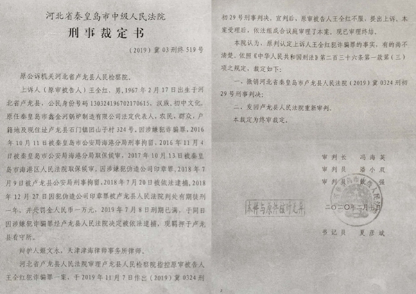 卢龙县法院的一审判决做出后,王全红上诉至秦皇岛市中级法院。该院于2020年2月7日做出(2019)翼03终519号刑事裁定书称:本院认为,原判认定上诉人王全红犯诈骗罪的事实,有的尚不清楚,遂裁定:撤销卢龙县人民法院(2019)冀0324刑初29号刑事判决书,发回卢龙县人民法院重新审判。